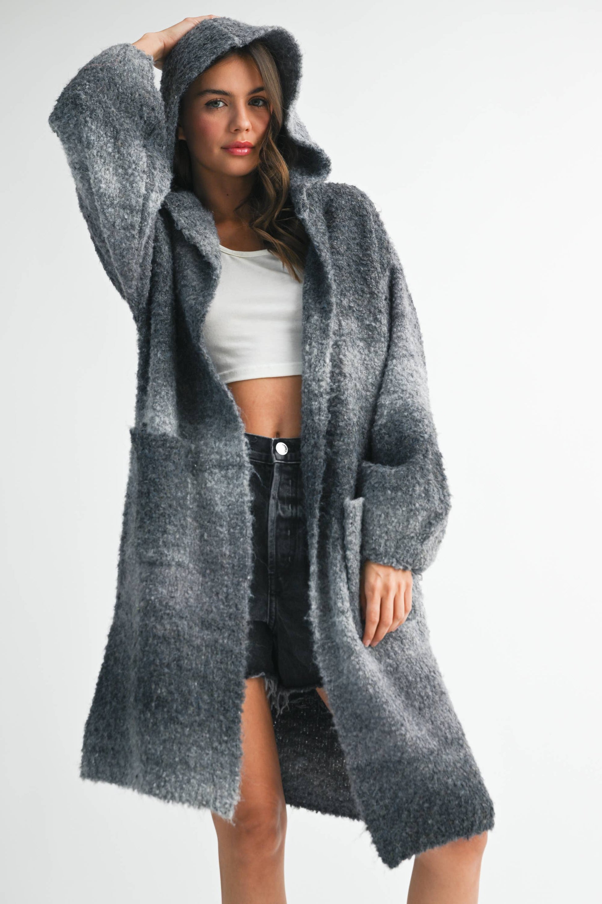 Introducing the return of our must-have Nelsi hooded cardigan designed with balloon sleeves and convenient pockets. This cozy, lightweight knit is perfect for layering and lounging, while the ombre finish adds a stylish touch. Embrace ultimate comfort and fashion with this versatile wardrobe essential. This one is a must for your fall/winter wardrobe. So soft and cozy! Available in gray.