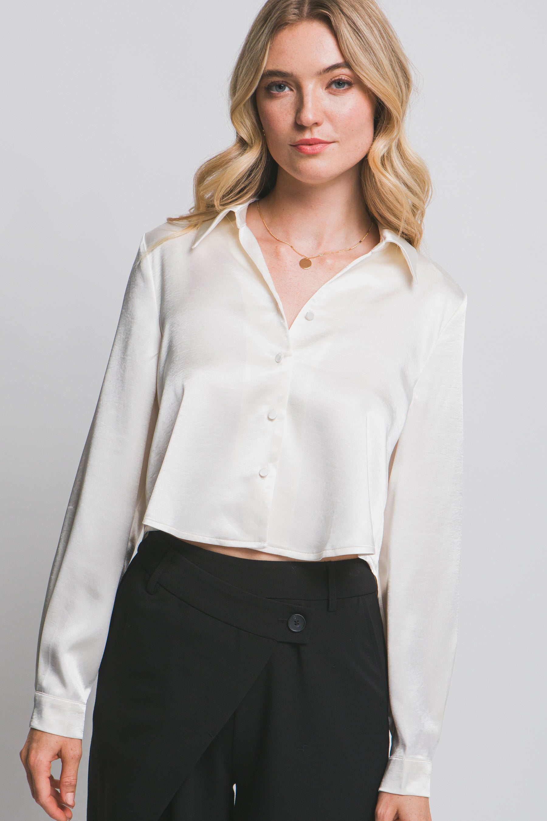 Elevate your holiday wardrobe with this satiny, soft cropped button-down shirt featuring a classic collar. Its smooth texture and tailored fit offer both comfort and style, making it an ideal choice for festive occasions and gatherings. The cropped length pairs effortlessly with high-waisted bottoms, providing a modern silhouette that balances elegance and ease. Perfect for those seeking a refined yet relaxed look during the holiday season. Available in ivory and black.