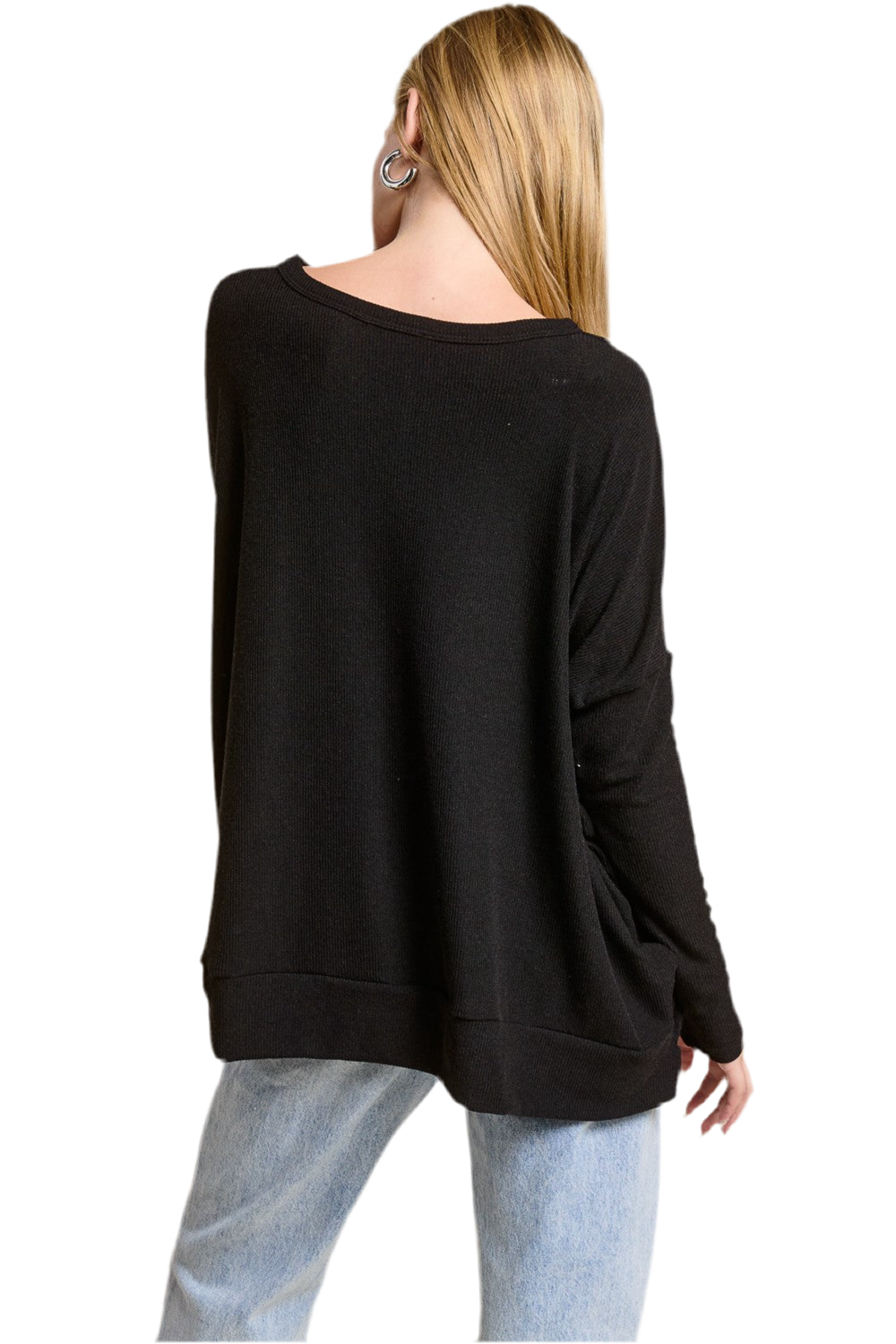 An Effortlessly cozy essential, this drop shoulder pullover features a relaxed silhouette with subtle high-low hem detailing. Made from lightweight rib knit that drapes beautifully without clinging, it's perfect for layering or wearing on its own. Thoughtful design details like the center seam and wide neckline give it a laid-back, elevated finish. Available in black and white.
