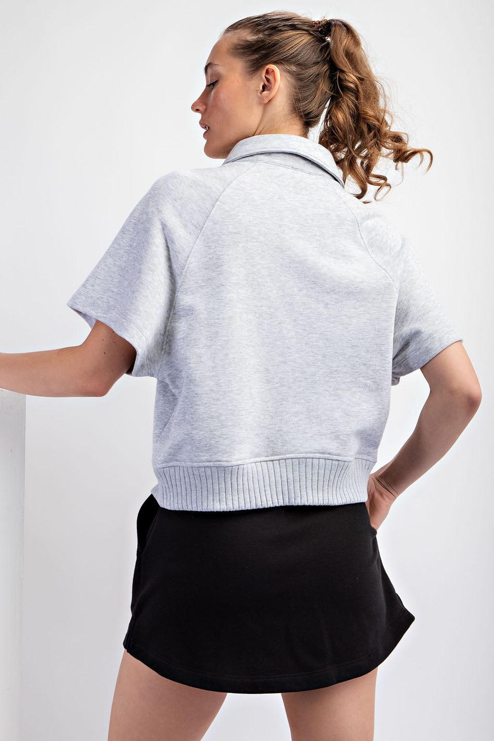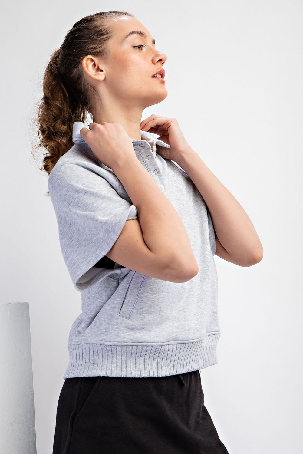 Effortless comfort meets casual style with the Crissa Top. Crafted from soft French terry fabric, this collared Henley features a button-up closure and relaxed loose fit that's perfect for laid-back days. Practical side pockets keep essentials within reach, while ribbed detailing at the waist adds subtle structure. A versatile wardrobe essential that transitions seamlessly from weekend lounging to casual outings. Available in heather gray.