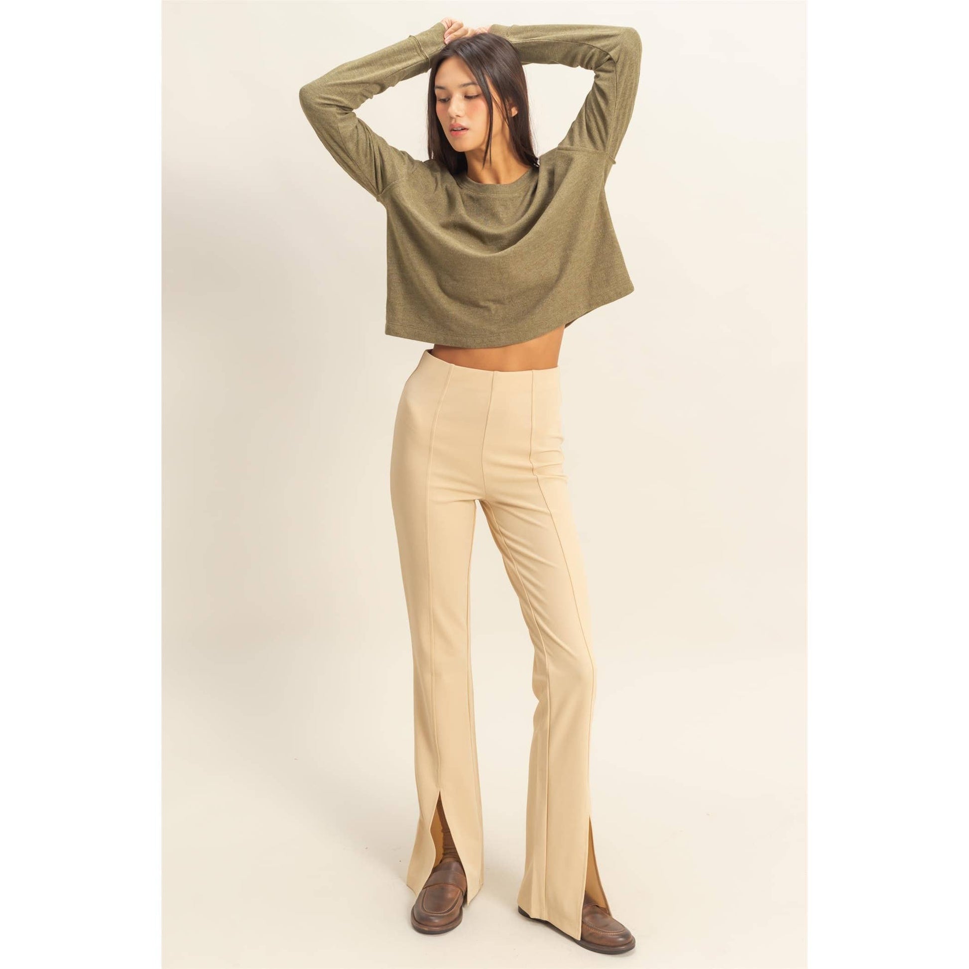 Elevate your casual wear with this cozy cropped sweatshirt. Featuring a comfy crew neckline, long sleeves, and a relaxed fit, this sweatshirt is perfect for lounging or running errands. The ribbed waist adds a touch of style and versatility. Pair it with your favorite jeans for a classic look. Available in olive