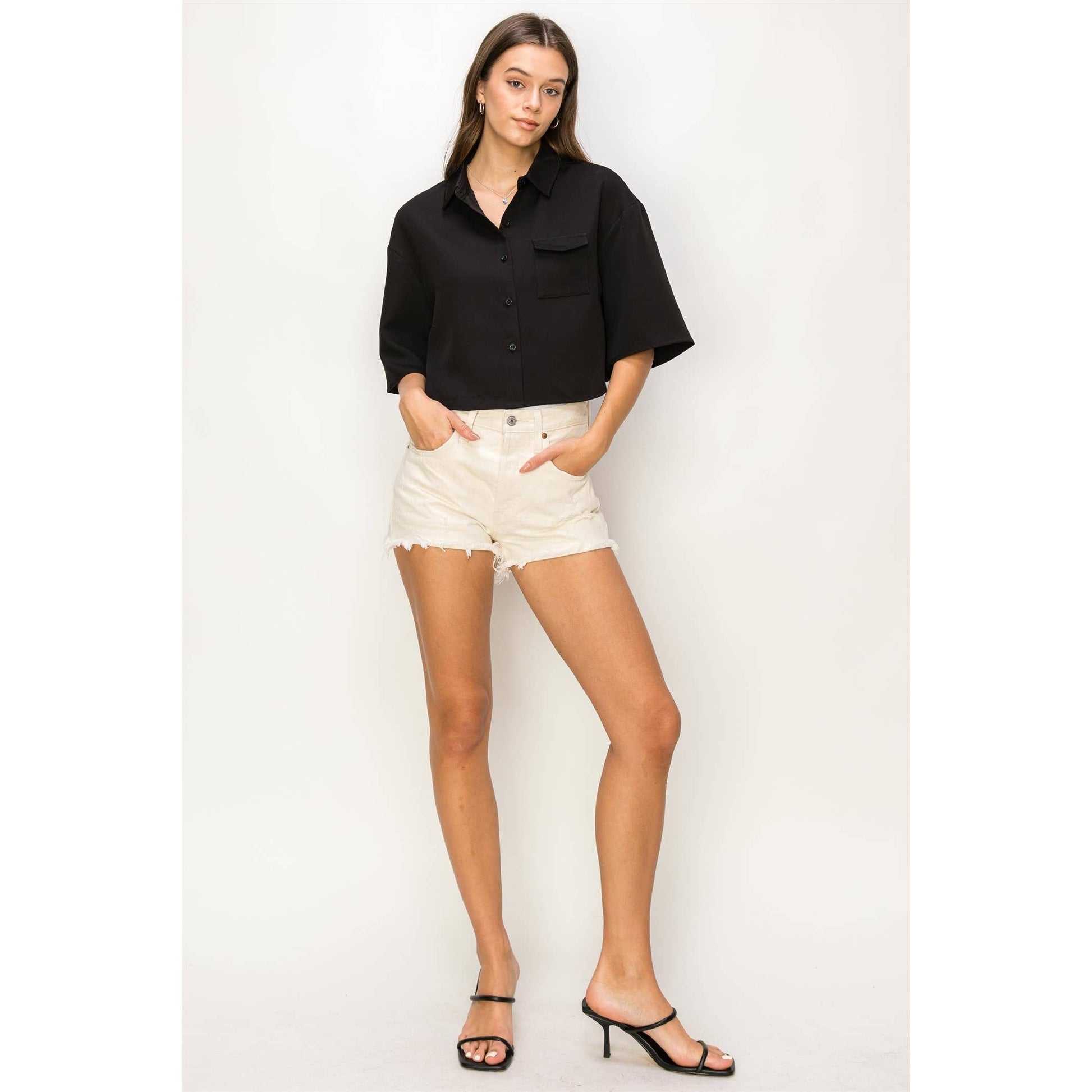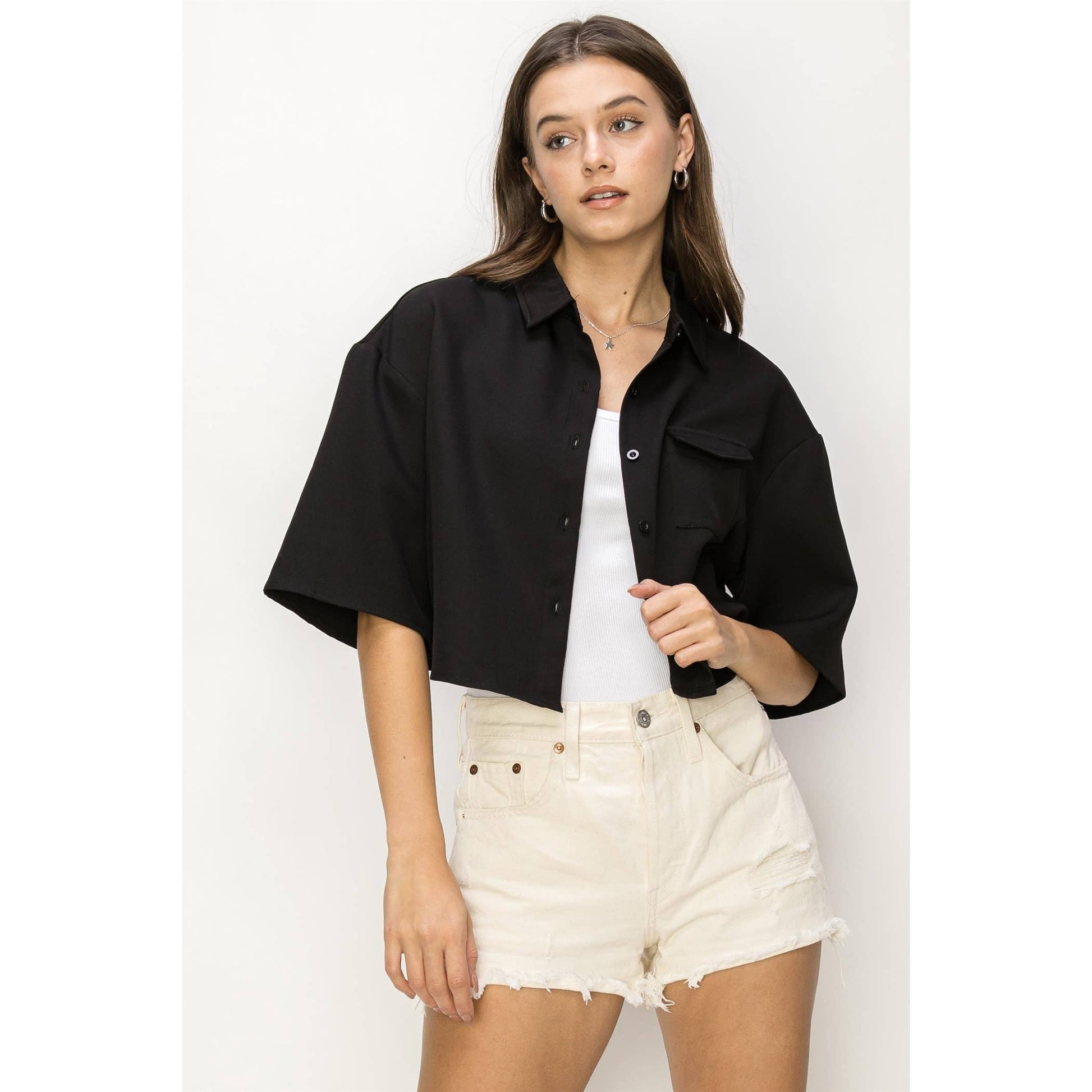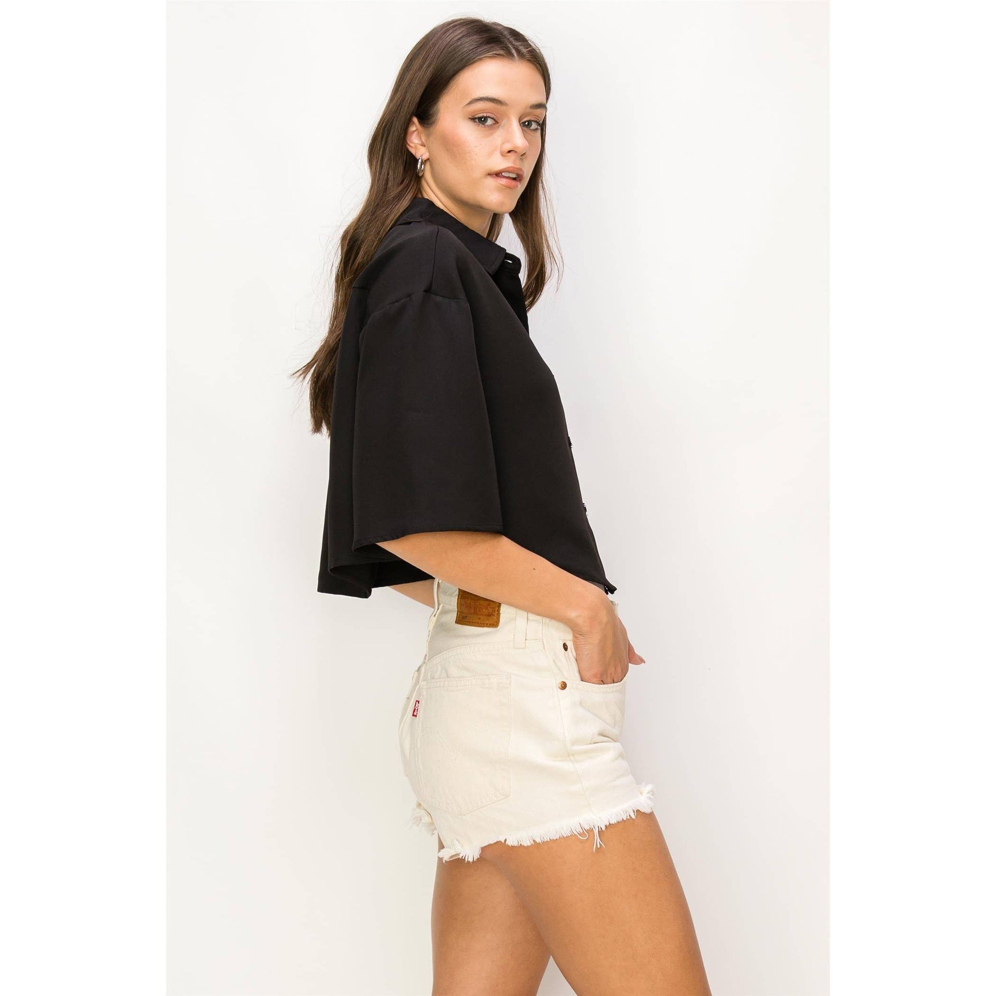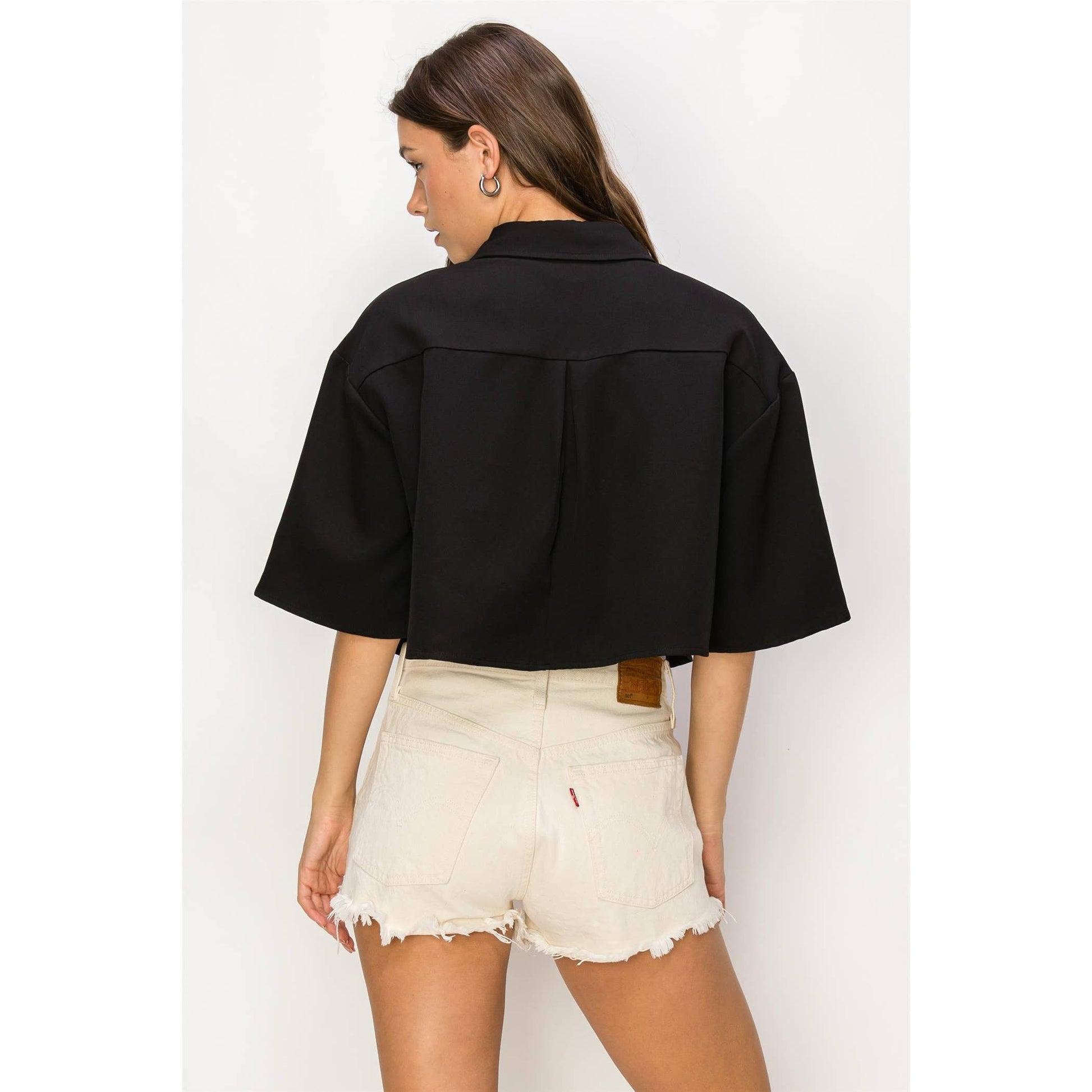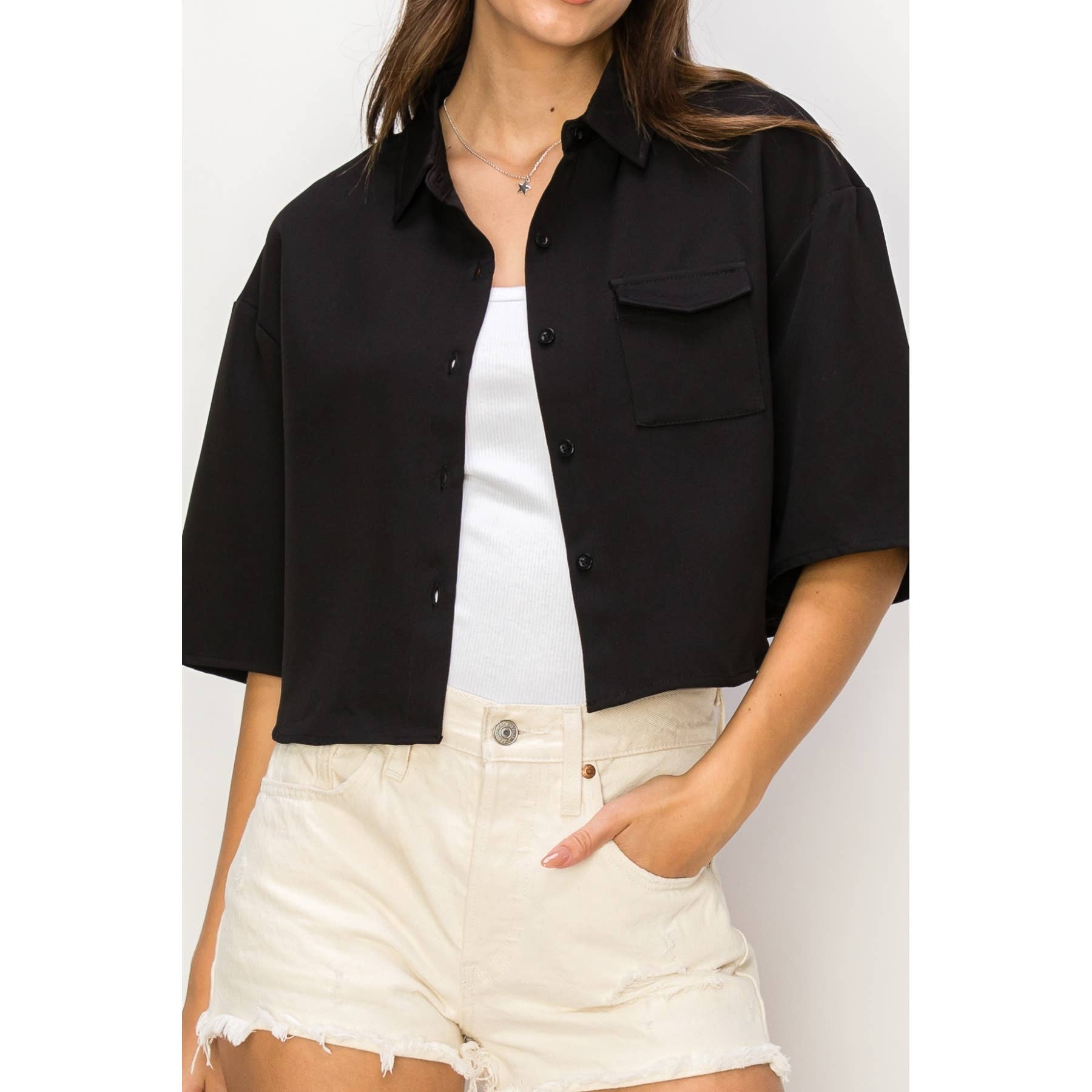 Effortlessly versatile, this cropped button-down shirt features elbow-length sleeves and a single chest pocket for a classic yet contemporary touch. Crafted from a lightweight fabric with a clean, finished hem, it offers breezy comfort and polished style. Whether you’re heading into the office or out for the evening, this wardrobe staple strikes the perfect balance between professional and playful.