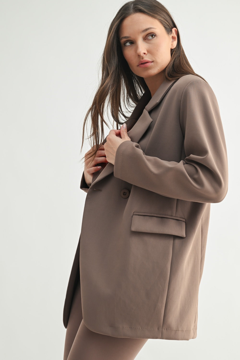 Made from mid-weight, 4-way stretch scuba fabric, this double-breasted oversized jacquard stripe blazer features a button closure, hand pockets and light padding in the shoulders for extra comfort. Ideal for formal and more casual occasions. Available in deep taupe.