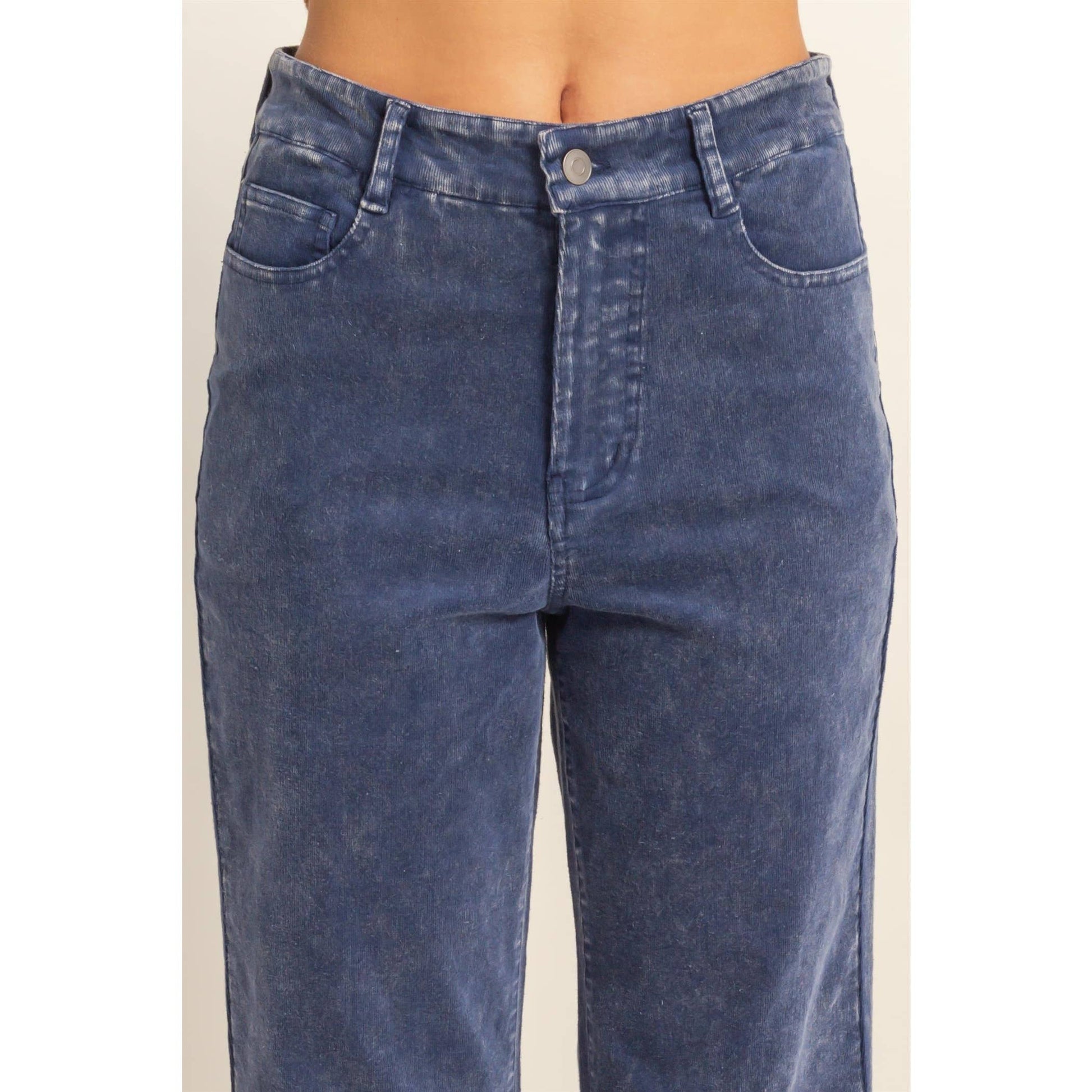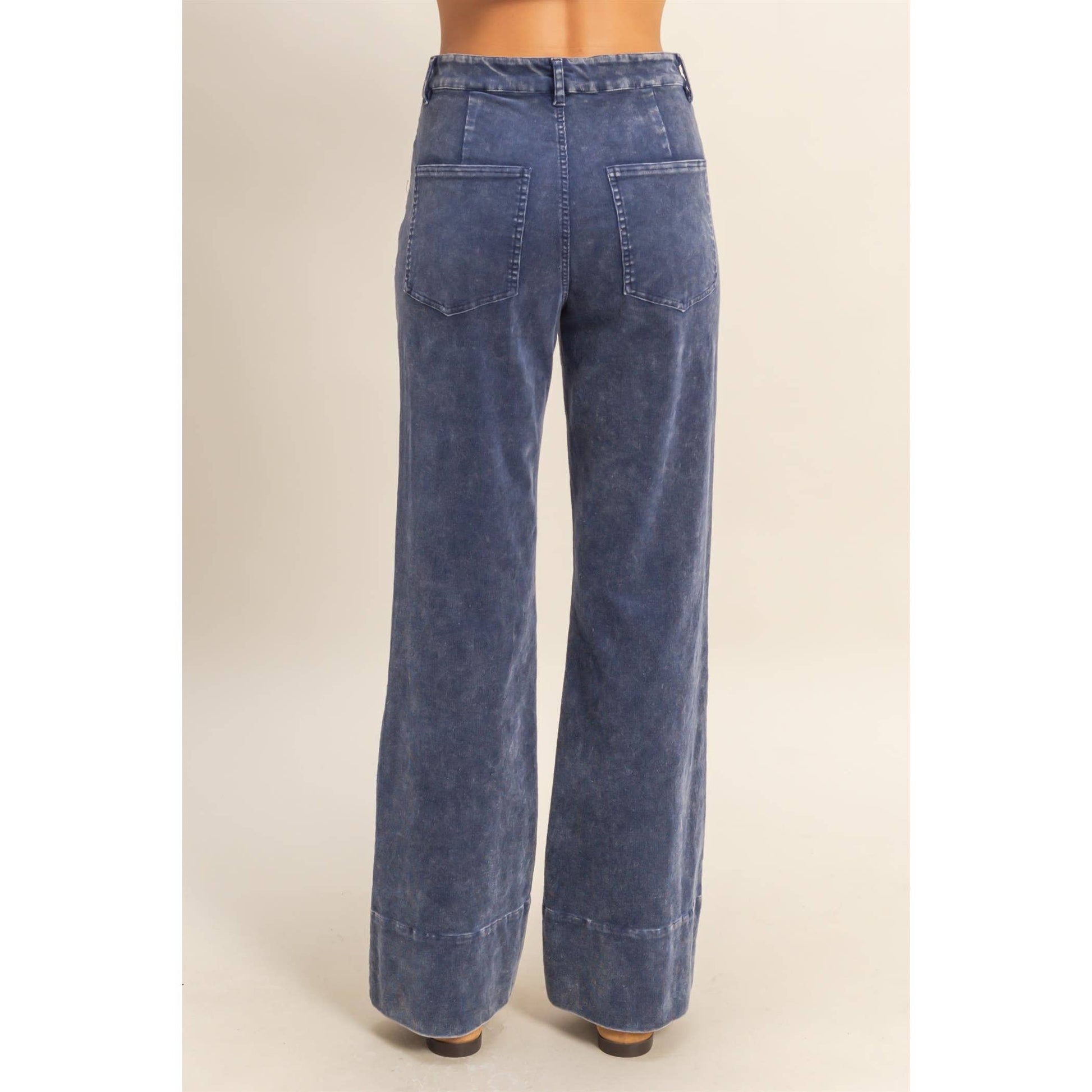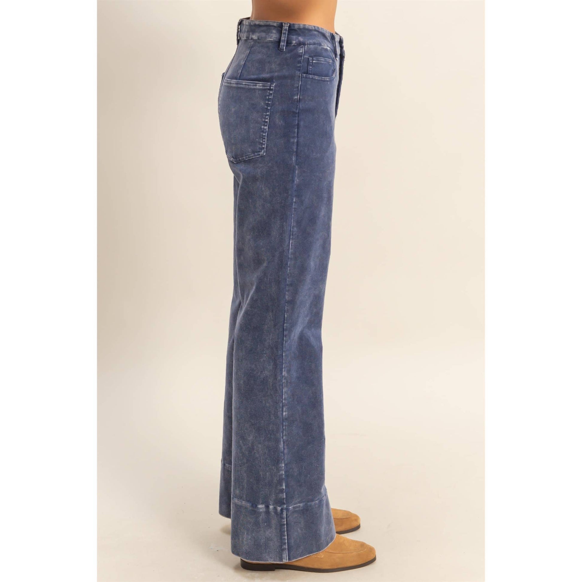 Embrace a blend of style and comfort with these mineral washed flare bottoms. The silhouette offers a relaxed fit with a subtle flare, making it ideal for various occasions, from a lazy weekend outing to a trendy night out. Pair it seamlessly with a snug top and statement sneakers or heels for an effortlessly chic look. The mineral wash treatment adds a unique texture, enhancing the overall appeal of the garment. Available in blue.