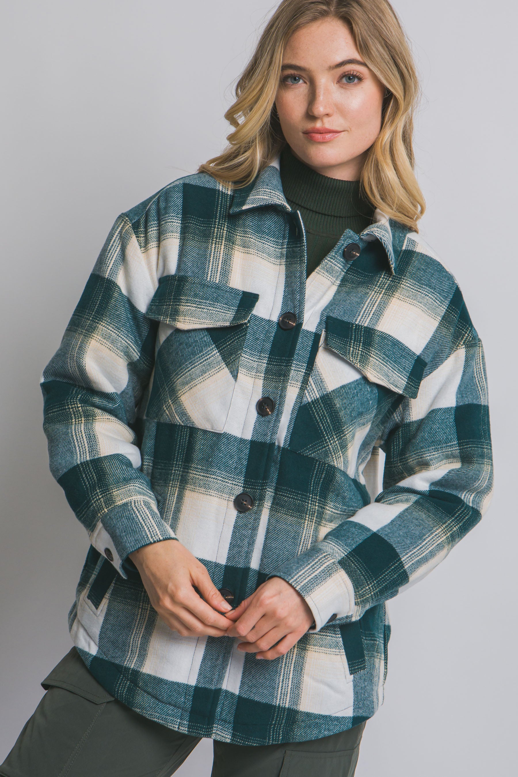 The Sylvie Shacket combines the structured silhouette of a shirt jacket with the warmth of sherpa lining, delivering versatile layering for transitional seasons. Crafted from super soft materials, this piece transitions effortlessly from casual to polished styling. The plush sherpa interior provides exceptional comfort and insulation without bulk, making it an ideal choice for layering over tees or lightweight sweaters. Perfect for those seeking a refined outerwear option that doesn't compromise on coziness. Available in teal.Â